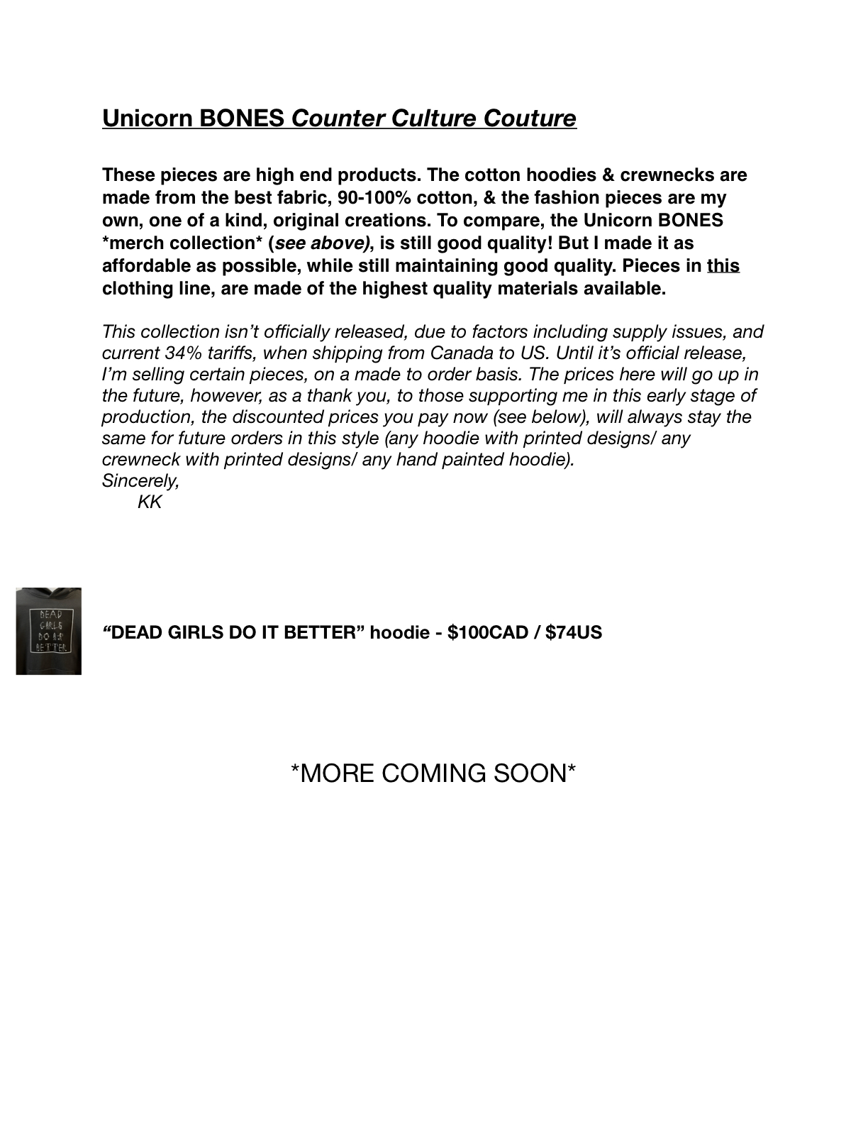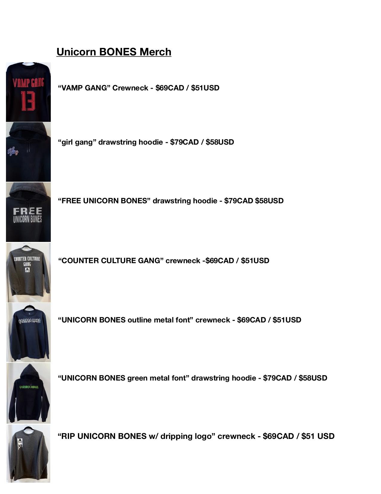 The online shop will be coming soon, but until then, please send email unicornbonesclothing@gmail.com Please include in the email: The clothing item(s) you want to purchase, what size, Your name, address, & phone number (if sending outside Canada).